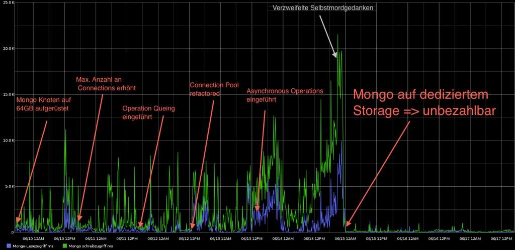 Wenn man jetzt noch regelmäßige Updates auf den Daten fährt, ist es zwingend nötig, dass das Storage schnell genug ist. Bei uns gab es diesbezüglich einen Engpass, mit dem Effekt, dass mongo beim schreiben (und manchmal auch beim Lesen) Timeouts geliefert hat (die Zeitspanne kann konfiguriert werden). Das war super schwer zu finden, lag bei uns aber an einem überlastetem Storage.